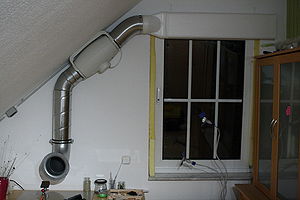 - Zuluftseite des Lüfters, aus Abluftrohr in 150 mm Durchmesser (links auf dem Foto, von oben nach unten):