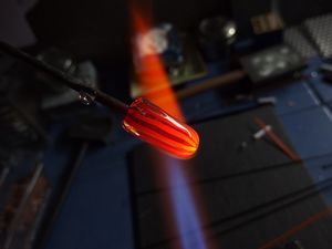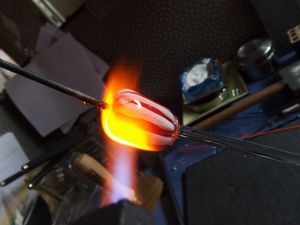 3. Gut erhitzen, eine Klarstange anheften und in die Länge ziehen. Die Dicke des Zugs sollte etwa 5 -7 mm betragen.